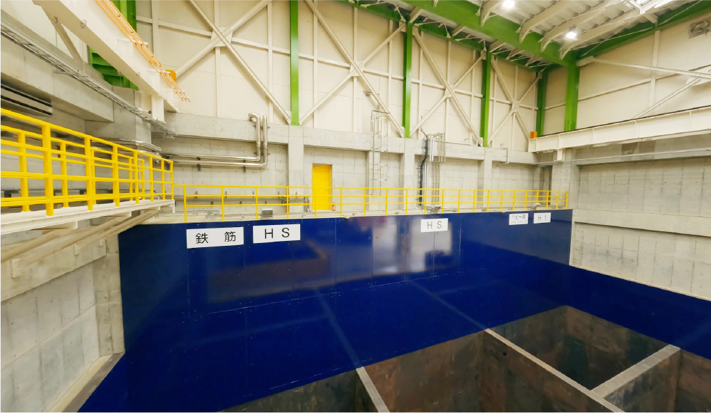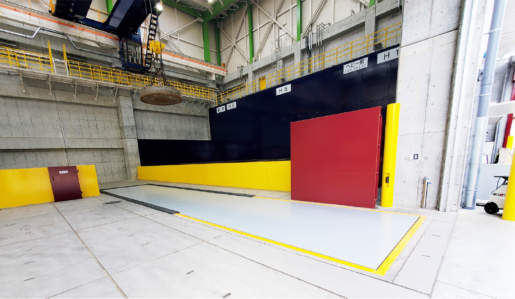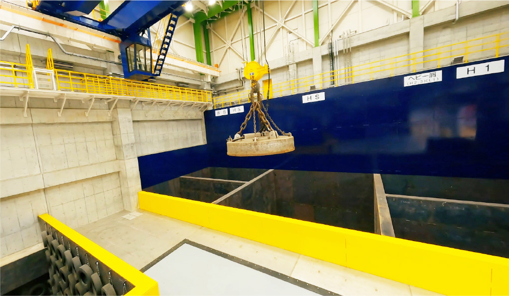 天井から場内を移動し、搬入や搬出時に、使用する協力な磁石のクレーンです。