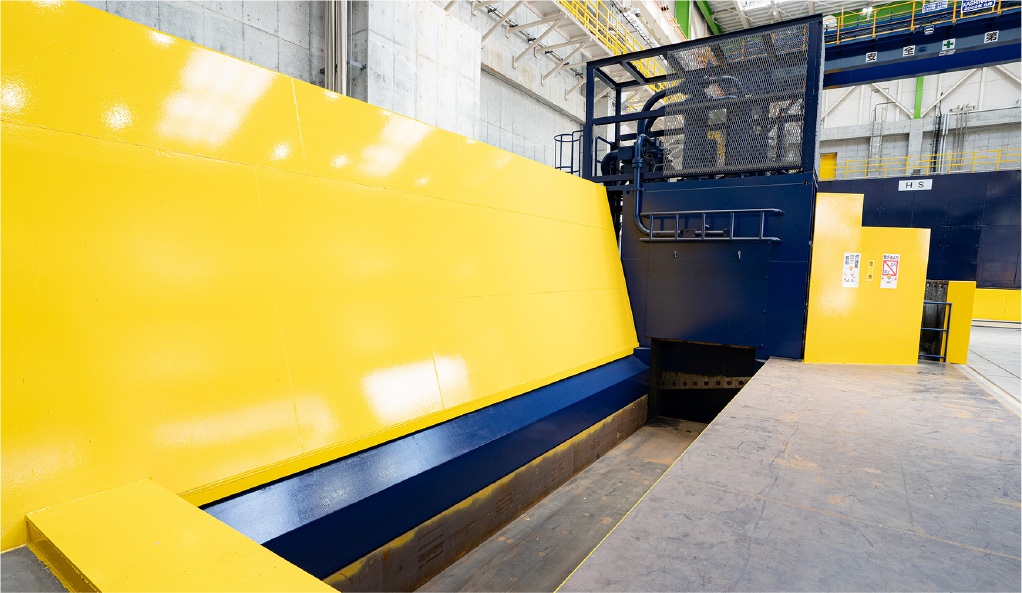 保管や搬出がしやすいように、また、スクラップに付着しているダストを取り除く為に使用する大型のギロチンです。